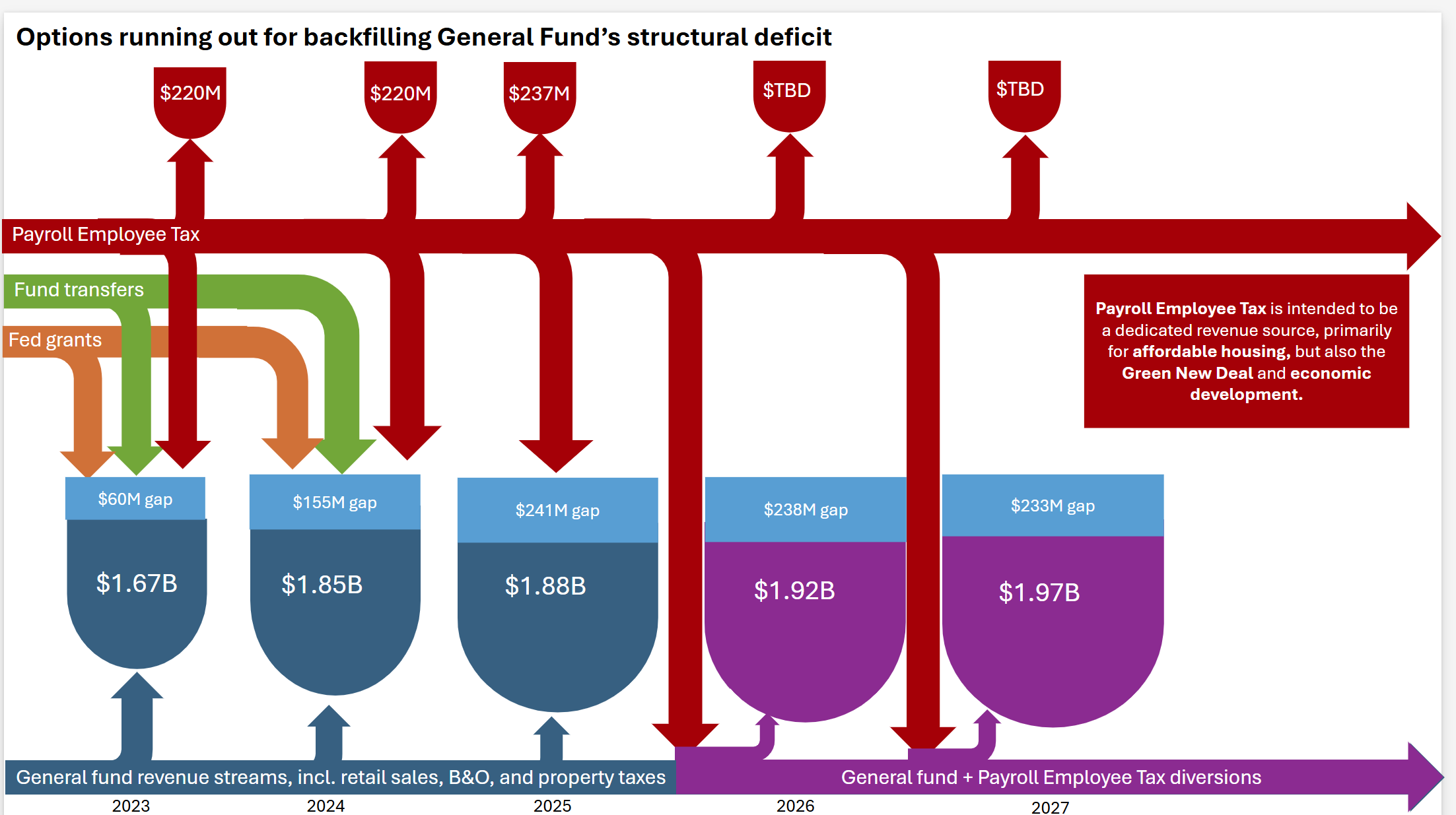 As the Mayor’s Office notes, “Each year since enacting the payroll tax in 2020, the City has balanced the General Fund using a “temporary” allocation of payroll tax revenues. Each of these decisions was made for a one-year period, with the assumption that the payroll tax would no longer be used for this purpose in the following year.”