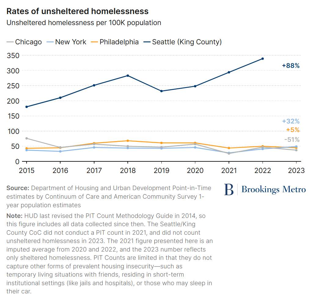 Among all cities, Seattle has the highest percentage of unsheltered homelessness, with over 57% of its homeless population living on the streets, compared to Philadelphia (18%) and Chicago (around 17%), and New York City (6%).