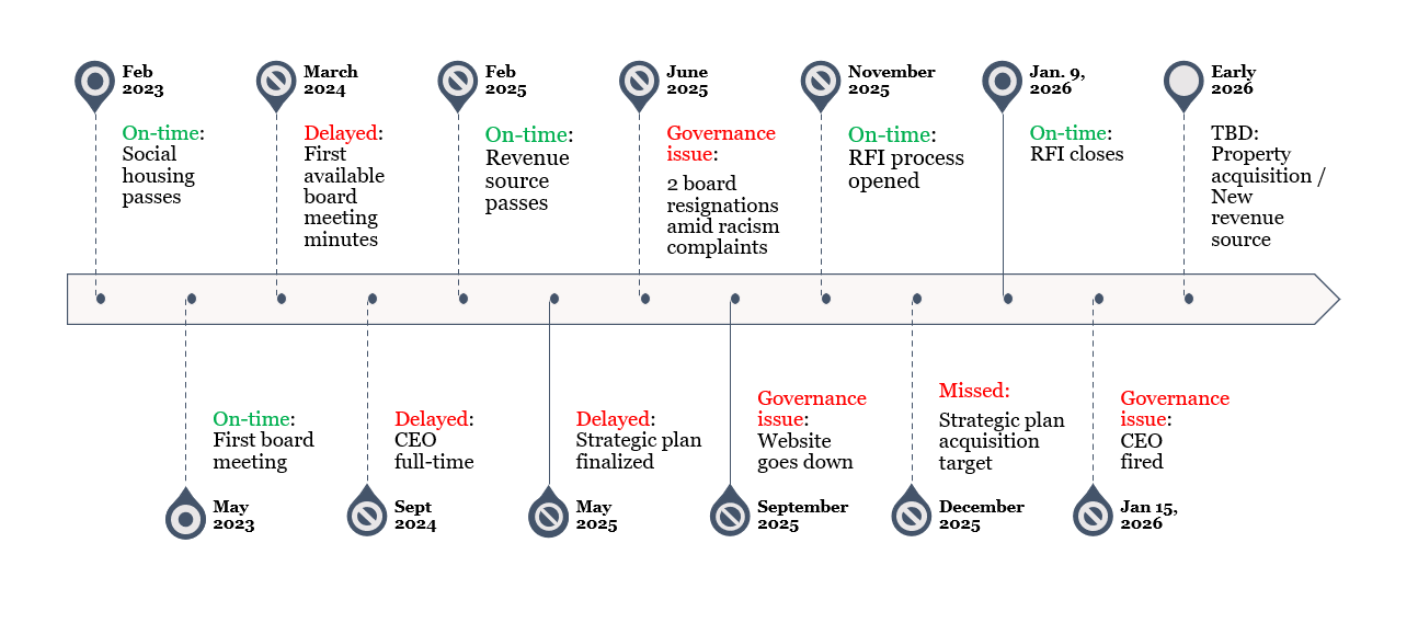 Three years later, the organization has yet to acquire a building — but it has begun the transition from institutional formation to market-facing execution. At the same time, its first CEO was fired days after a key development pipeline deadline.